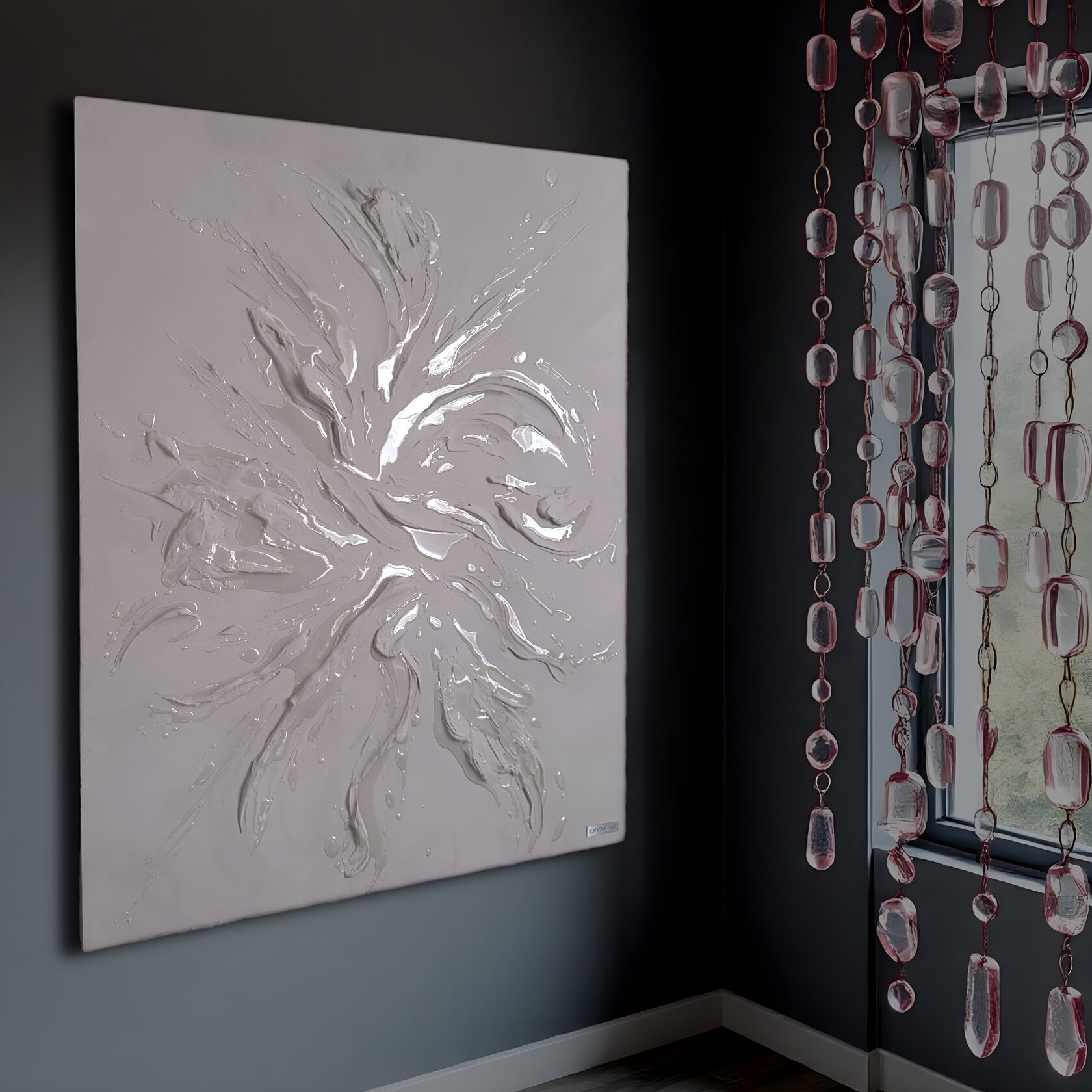 Картина сочетает в себе текстурные элементы и абстрактные формы, создавая ощущение легкости и динамики. Лепестки или брызги, направленные от центра, словно стремятся к свободе, а добавление смолы придает глубину и интересный визуальный эффект. Монохромная палитра серо-розоватых оттенков создает атмосферу спокойствия и элегантности, что делает эту работу идеальным дополнением для интерьера.